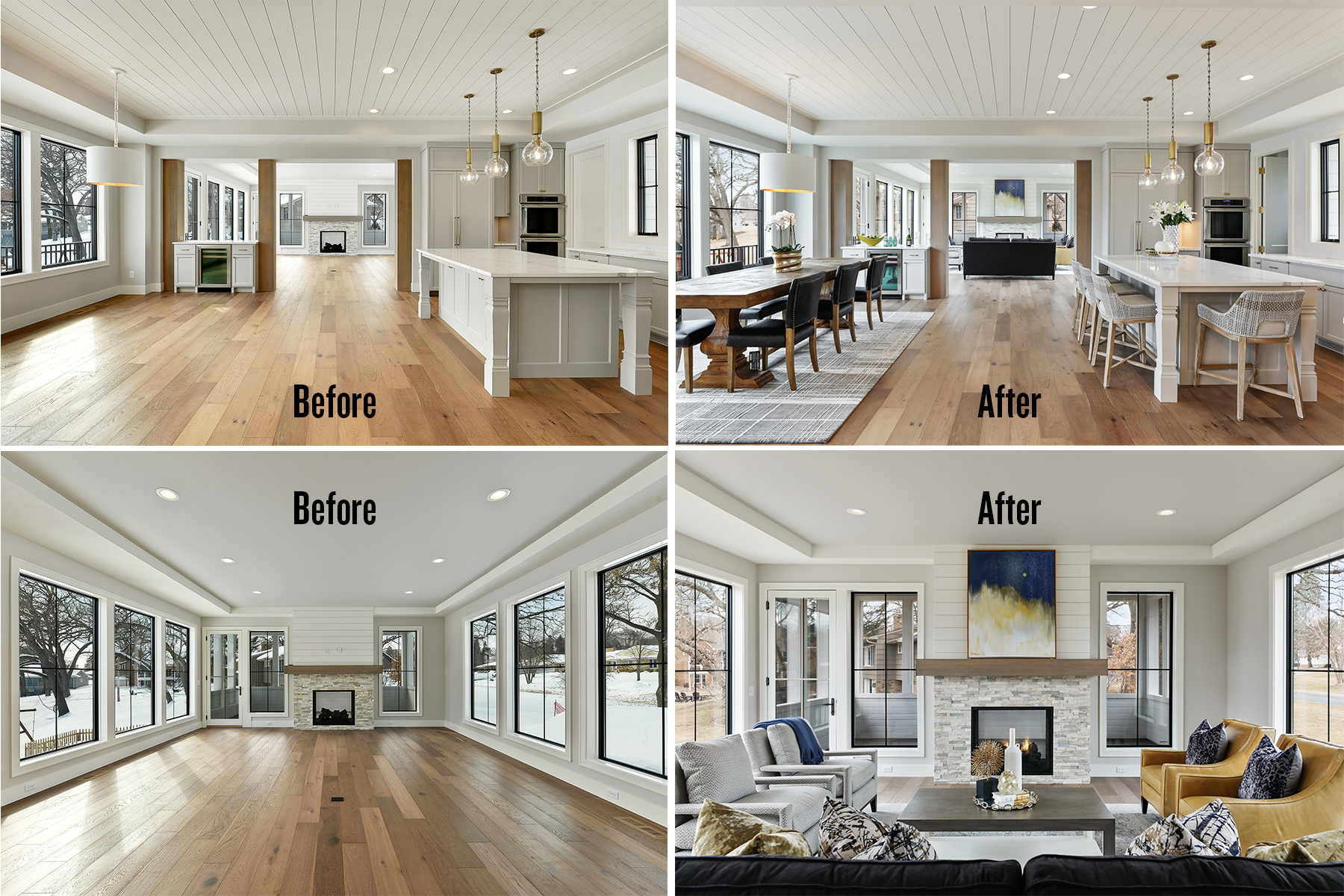 Staging also works very well in new construction (spec homes). In the pictures below you can see how cavernous the living area feels in the first photos, yet how modish and inviting it feels after being staged.